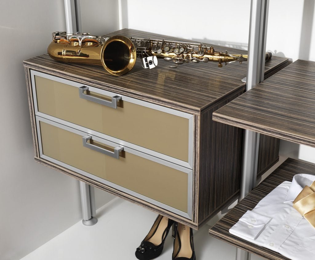 Er is een ruime keuze in afwerking en indeling zoals praktische laden die eventueel in combinatie met glasplaten erboven een plekje vormen voor het uitstallen van accessoires en geurtjes. Bij voldoende ruimte kan er eveneens een ladeneiland geplaatst worden. Het biedt gelegenheid om de kleding op te vouwen of om uw combinatie klaar te leggen voor de volgende dag. Voor de indeling wordt veelal gebruik gemaakt van onze kastinterieurs. Is er de voorkeur voor een luchtige indeling waarin het lijkt of alles zweeft, dan zijn er aluminiumprofielen die de staande wand vervangen. Hieraan kunnen legplanken, kledingroeden en ladenblokken worden gemonteerd.